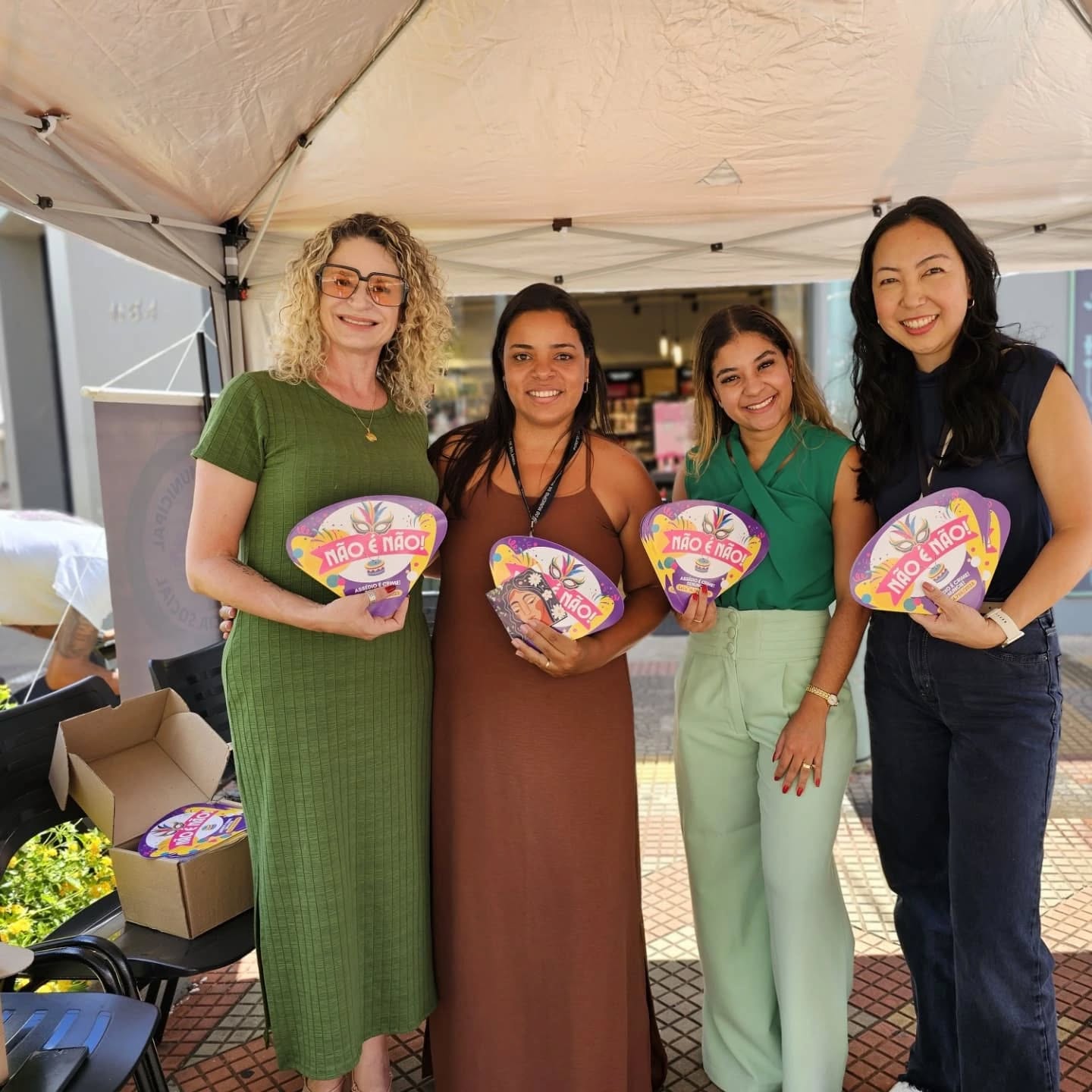 A secretária de Assistência Social, Michele Pereira, a diretora de Políticas Públicas para às Mulheres, Viviane Vernilo, e servidoras municipais estão fazendo a distribuição de leques, com telefones úteis para quando uma mulher precisar de apoio ou socorro!
