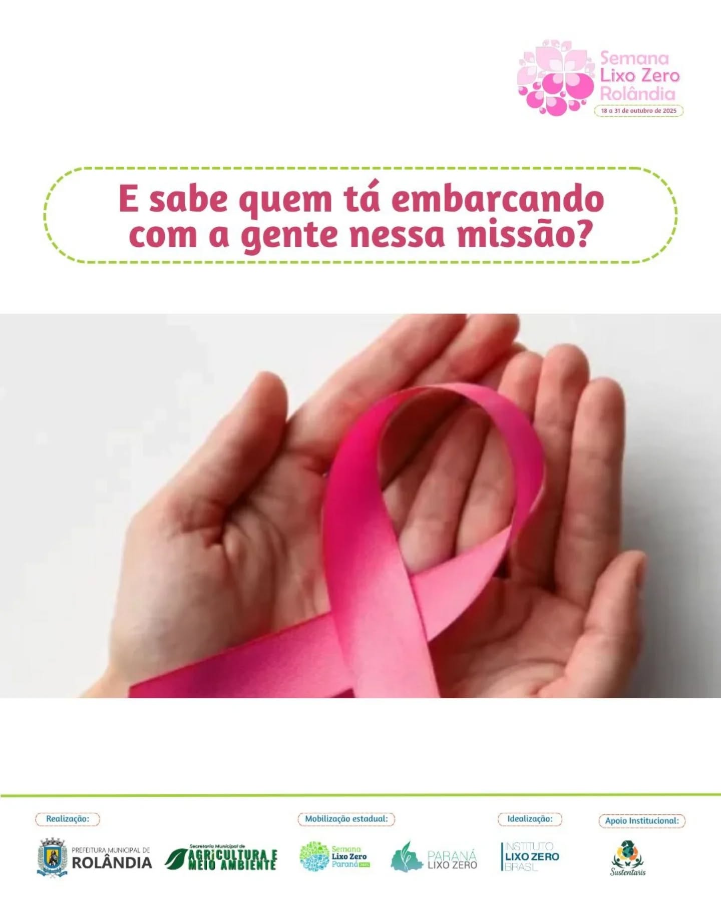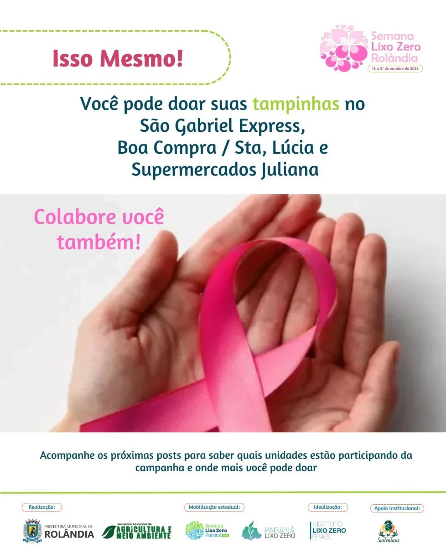 Durante todo o mês de outubro, em destaque à Semana Lixo Zero Rolândia (18 a 31 de outubro de 2025), estaremos realizando uma campanha especial: a arrecadação de tampinhas plásticas e blisters de remédios, que serão destinados ao Hospital do Câncer de Londrina.