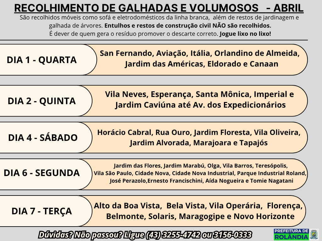 As Secretarias de Serviços Públicos e de Agricultura e Meio Ambiente informam que a empresa terceirizada que presta serviço ao município, a SANETRAN, passa recolhendo volumosos deixados na calçada (móveis como sofá e eletrodomésticos da linha branca), além de restos de jardinagem e ou galhada de árvores.