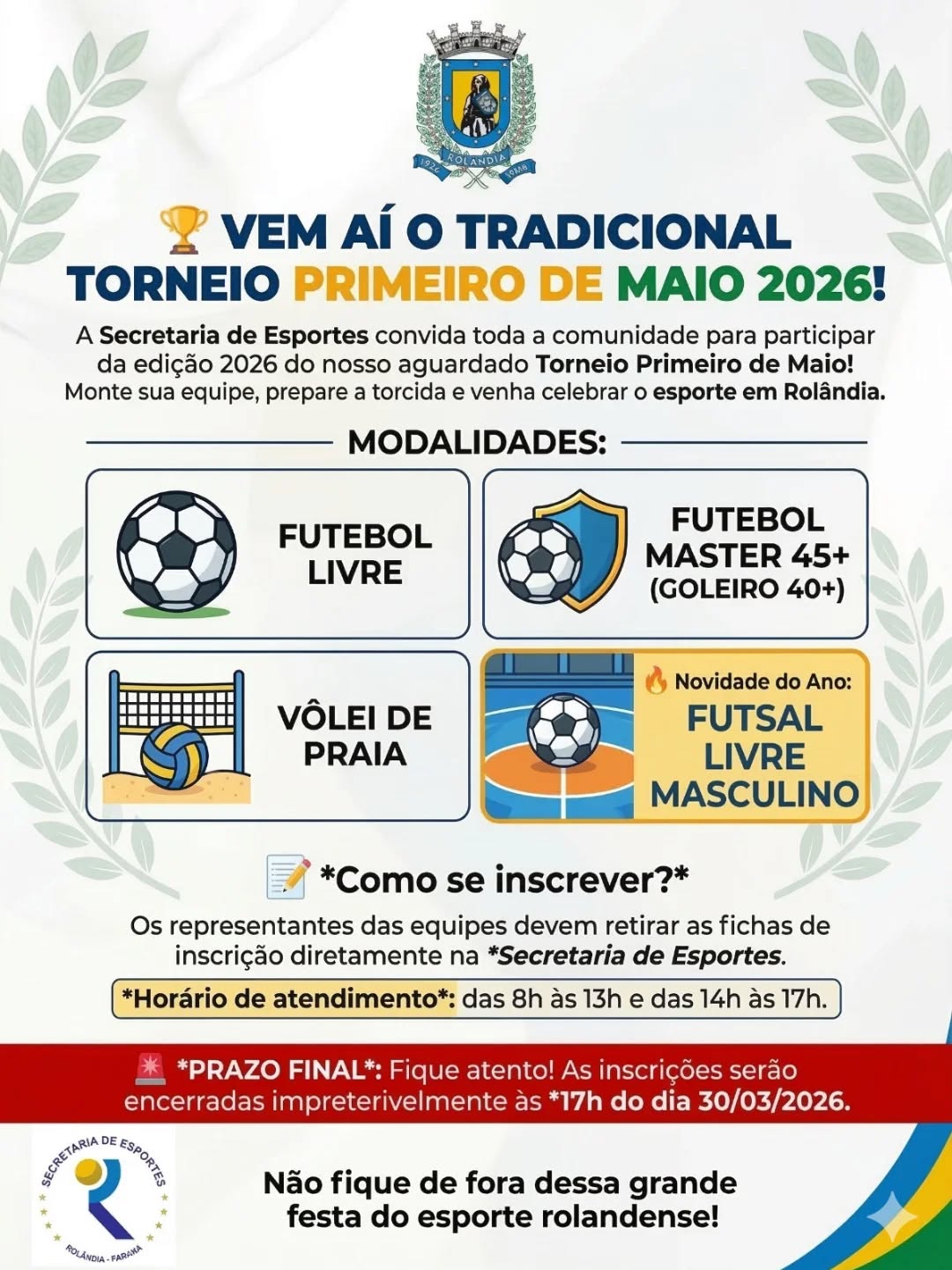 INSCRIÇÕES ABERTAS PARA O TORNEIO PRIMEIRO DE MAIO! A Secretaria de Esportes convida toda a comunidade para participar da edição 2026 do nosso aguardado Torneio Primeiro de Maio! Monte sua equipe, prepare a t...