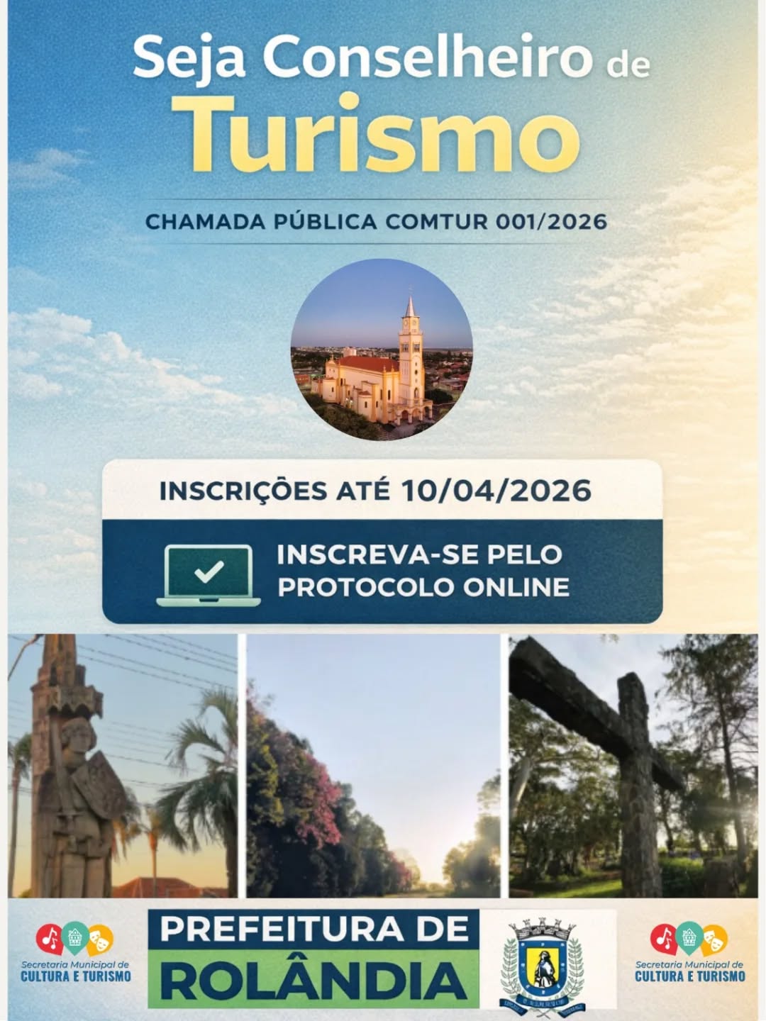 Venha participar do Conselho Municipal de Turismo (COMTUR) A Prefeitura de Rolândia, por meio da Secretaria Municipal de Cultura e Turismo, torna pública a abertura da Chamada Pública COMTUR 001/2026, destinada à sele&cc...