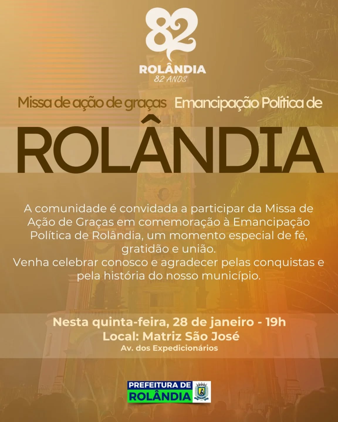 Missa celebra os 82 anos de emancipação política de Rolândia Nesta quarta-feira, dia 28 de janeiro, uma Missa de ação de graças pelo aniversário de 82 anos de emancipação pol&iac...
