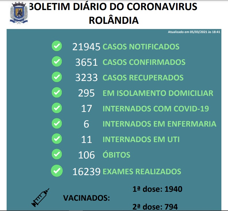 A Secretaria Municipal de Saúde de Rolândia informa sobre os casos de covid-19 na cidade. Em relação ao último levantamento, tem-se os seguintes números:Novos casos registrados: 76Total de casos registrados: 3.727Pacientes em isolamento domicil...