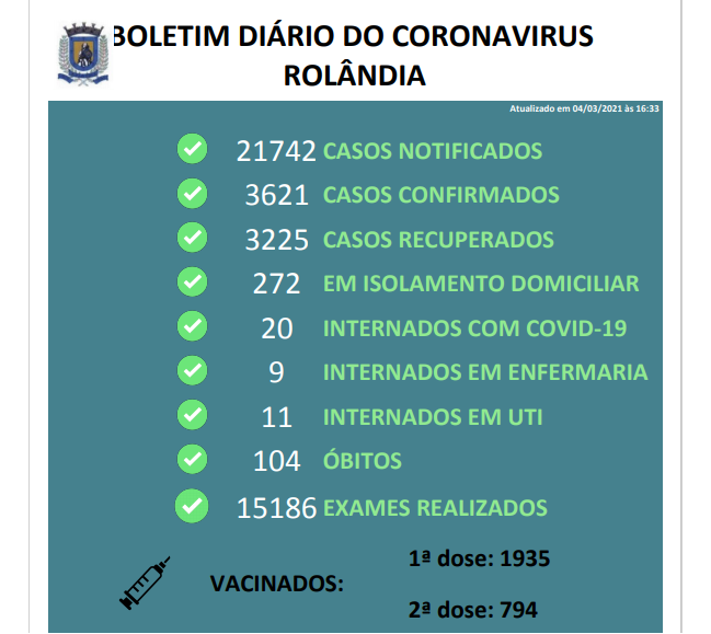 A Secretaria Municipal de Saúde de Rolândia informa sobre os casos de covid-19 na cidade. Em relação ao último levantamento (de terça, dia 2), tem-se os seguintes números: Novas notificações: 306Total de notificações: 21.436 Novos caso...