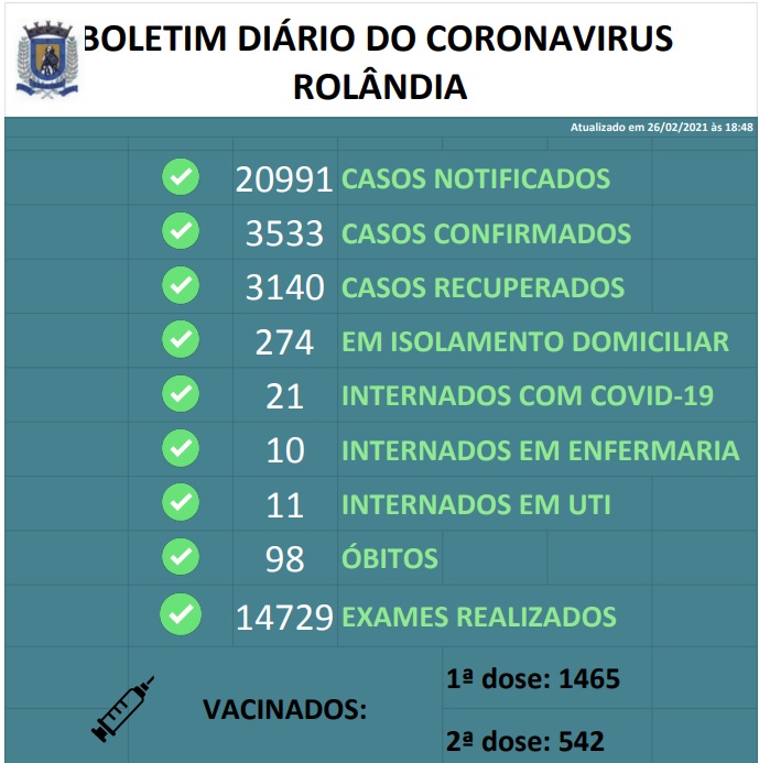 Com pesar e solidariedade aos familiares e amigos, a Secretaria Municipal de Saúde informa um óbito de paciente do sexo masculino de Rolândia em decorrência de Covid-19:Paciente tinha 60 anos, era portador de doença cardiovascular, doença pul...