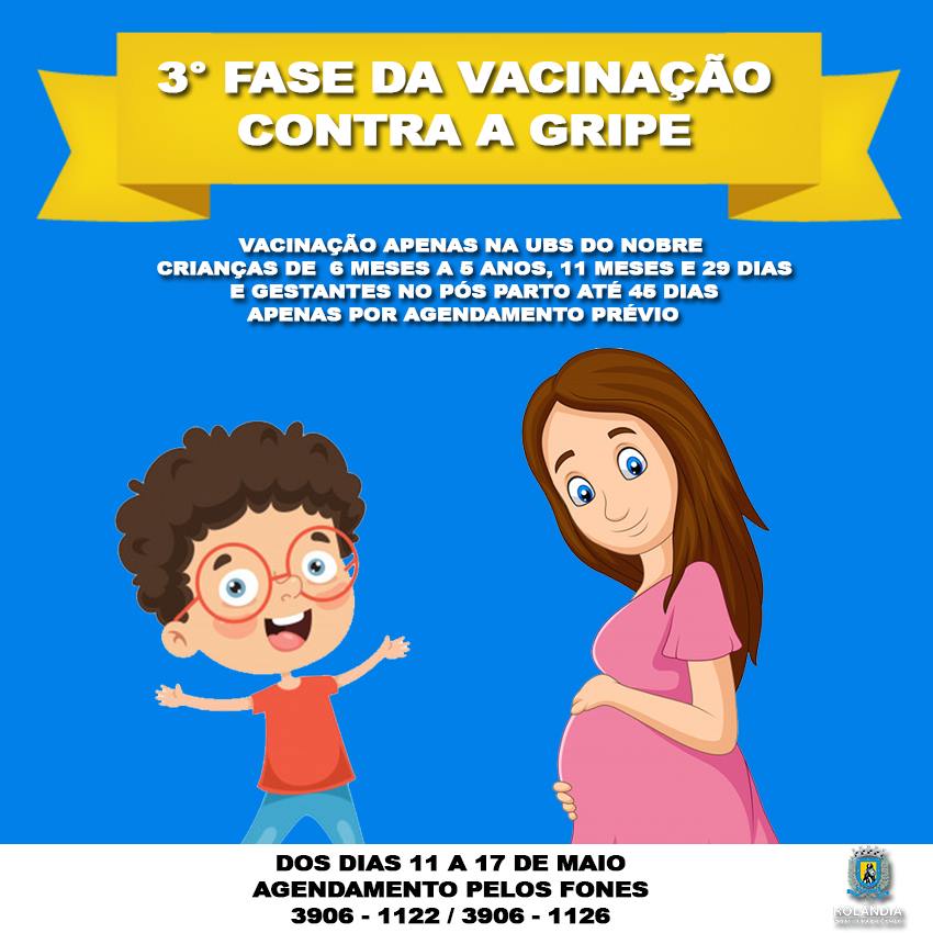 O Ministério da Saúde informa que a terceira fase da campanha de vacinação contra a gripe teve início hoje e será dividida em duas etapas. A primeira ocorre no período de 11 a 17 de maio com foco nas pessoas com deficiência; crianças de 6 ...