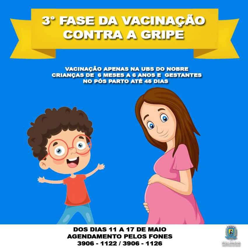O Ministério da Saúde informa que a terceira fase da campanha de vacinação contra a gripe terá início no dia 11 de maio (segunda-feira) e será dividida em duas etapas. A primeira ocorre no período de 11 a 17 de maio com foco nas pessoas ...