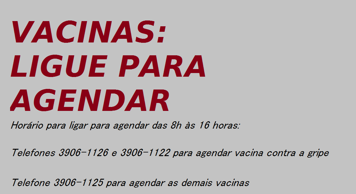 A Secretaria Municipal de Saúde informa que a partir desta terça-feira, dia 14 de abril, vai iniciar o agendamento por telefone da aplicação das vacinas do calendário de rotina do Ministério da Saúde e também vacinas contra a gripe. As vacina...