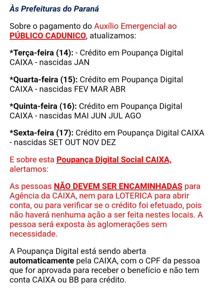 A Secretaria Municipal de Assistência Social informa que a CAIXA iniciou novas etapas de disponibilização do Auxílio Emergencial. Cerca de R$ 4,7 bilhões do benefício serão disponibilizados a 9.426.703 brasileiros do Cadastro Único (CadÚni...