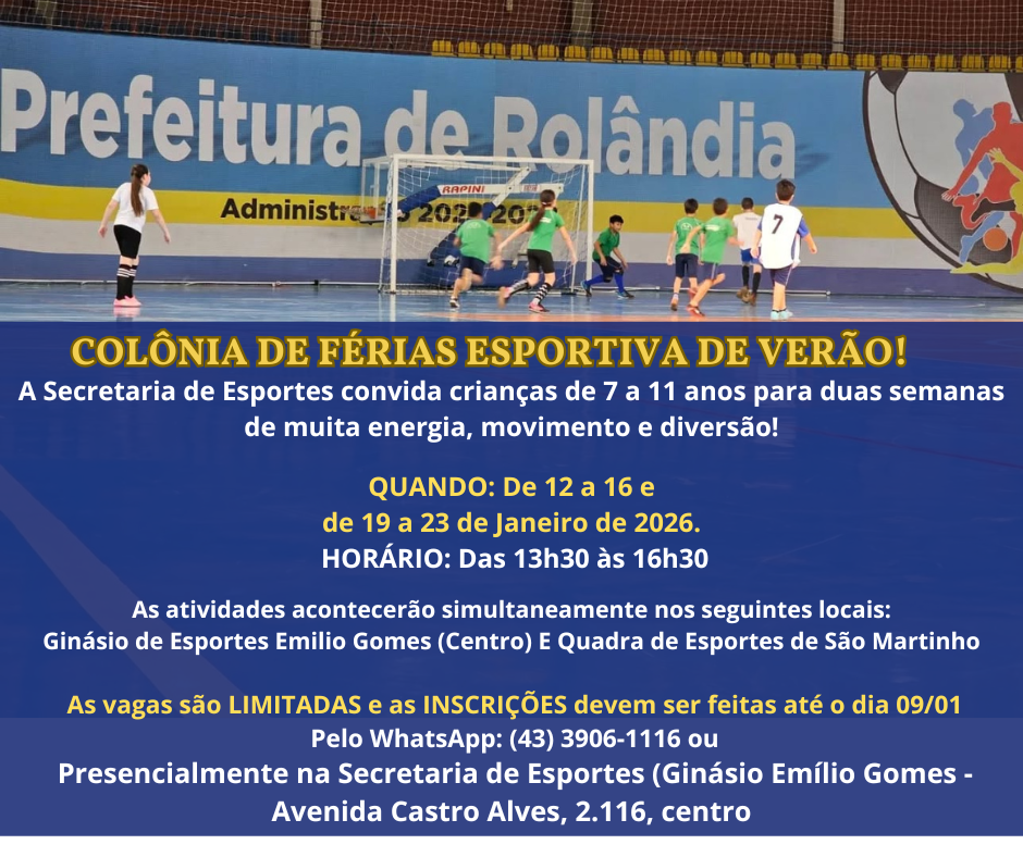 Vem aí a 1ª Colônia de Férias Esportiva de Verão! Pais e responsáveis, preparem a garotada! A Secretaria de Esportes convida crianças de 7 a 11 anos para duas semanas de muita energia, movimento e...