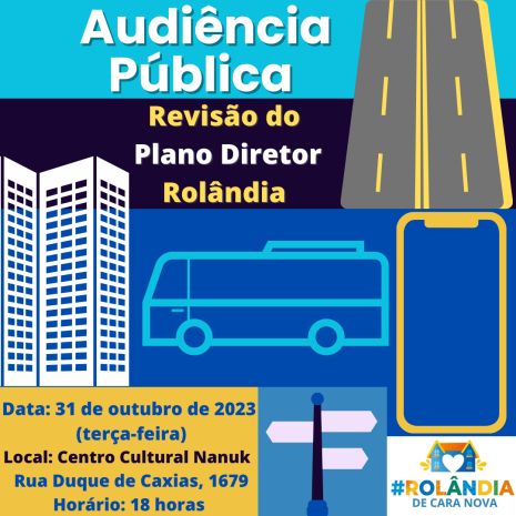 A Prefeitura do Município de Rolândia, por meio da secretaria de Planejamento, convida toda a população para participar da Audiência Pública de Revisão do Plano Diretor. Data: 31 de outubro de 2023 (ter...