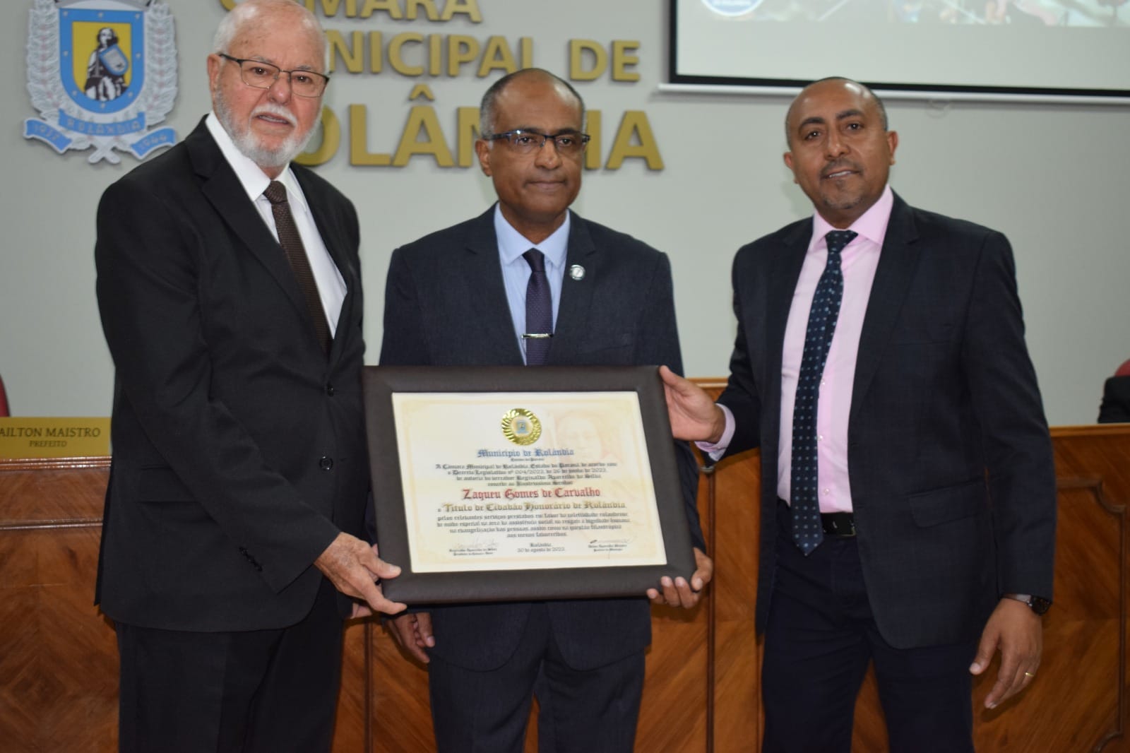 PREFEITO PRESTIGIA SOLENIDADE DE ENTREGA DE TÍTULO DE CIDADÃO HONORÁRIO AO PASTOR ZAQUEU GOMES DE CARVALHONa noite desta quarta-feira, 30 de agosto, na Câmara Municipal, o prefeito Ailton Maistro, a primeira-dama Ana Maria Mungo Maistro e a secre...