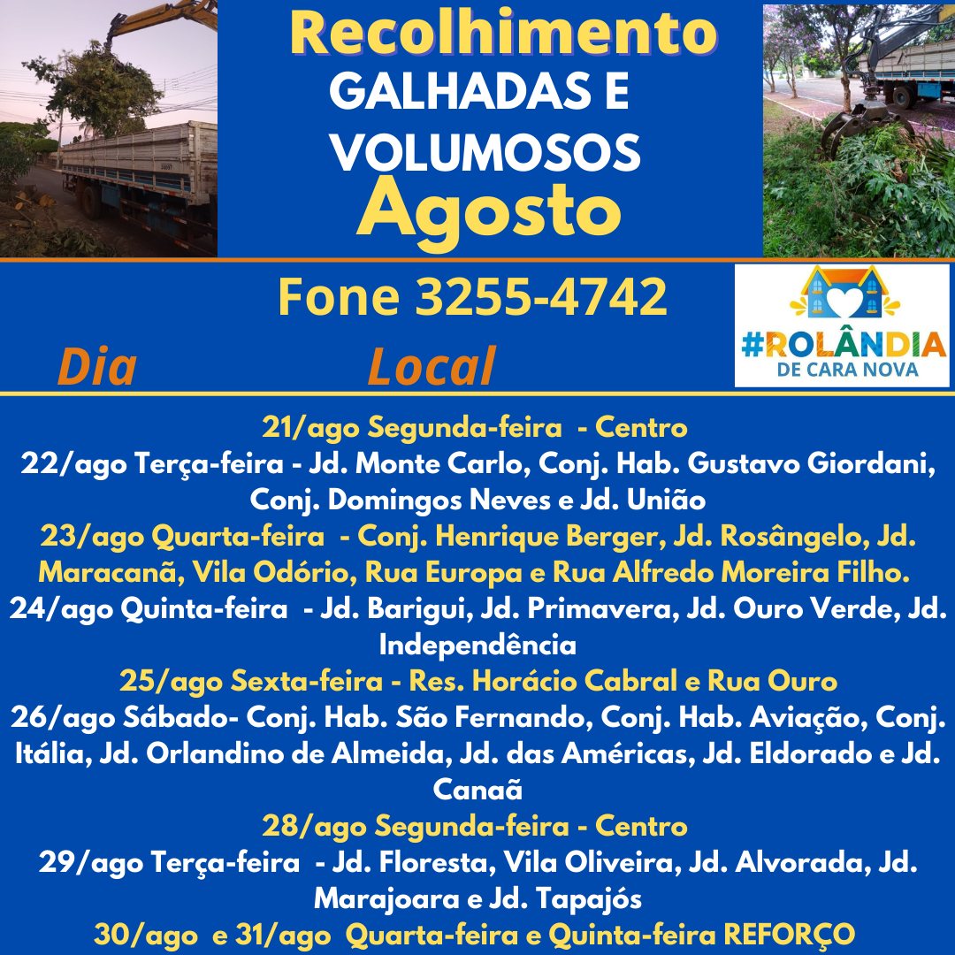 AGENDA DA SANETRAN PARA RECOLHER GALHADAS E VOLUMOSOS -AGOSTOA Secretaria de Agricultura e Meio Ambiente informa que a empresa terceirizada que presta serviço ao município, a SANETRAN, faz a divulgação das regiões em que vai passar recolhendo vo...