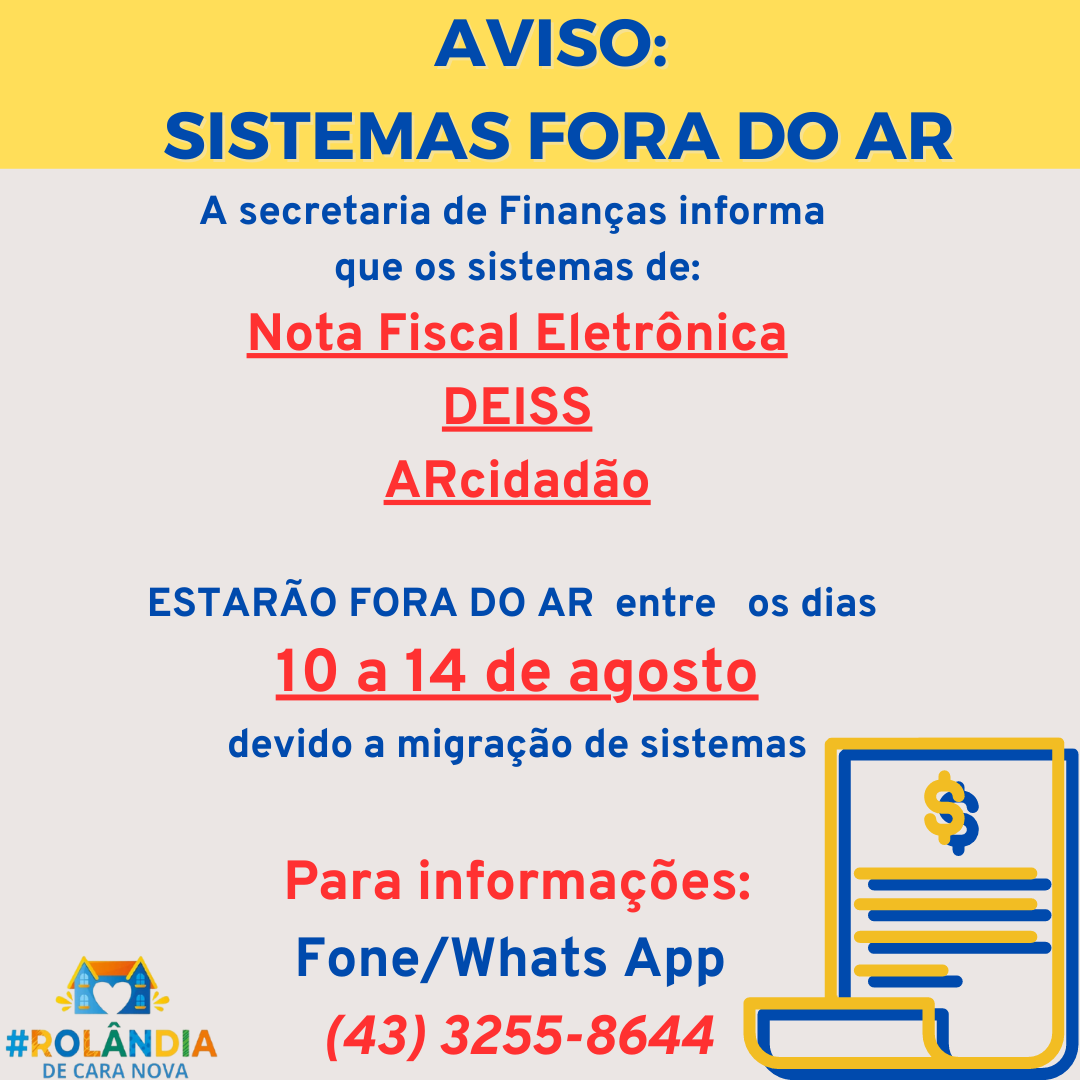 AVISO: SISTEMAS FORA DO ARA secretaria de Finanças informa que os sistemas de Nota Fiscal Eletrônica, DEISS e ARcidadão ESTARÃO FORA DO AR, entre dias 10 a 14 de agosto, devido a migração de sistemas. Mais informações, (43) 3255-8644....