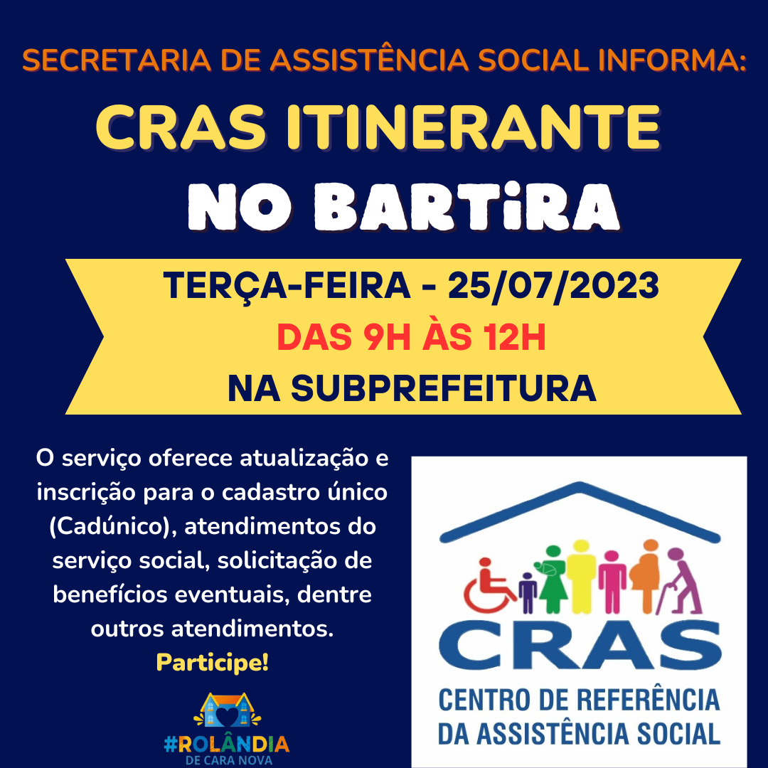 CRAS ITINERANTE NO BARTIRA A secretaria de Assistência Social informa que nesta terça-feira, , das 9h às 12h, em frente da Subprefeitura, haverá uma ação denominada "CRAS ITINERANTE", no distrito do Bartira.O trabalho vai oferecer atualização...