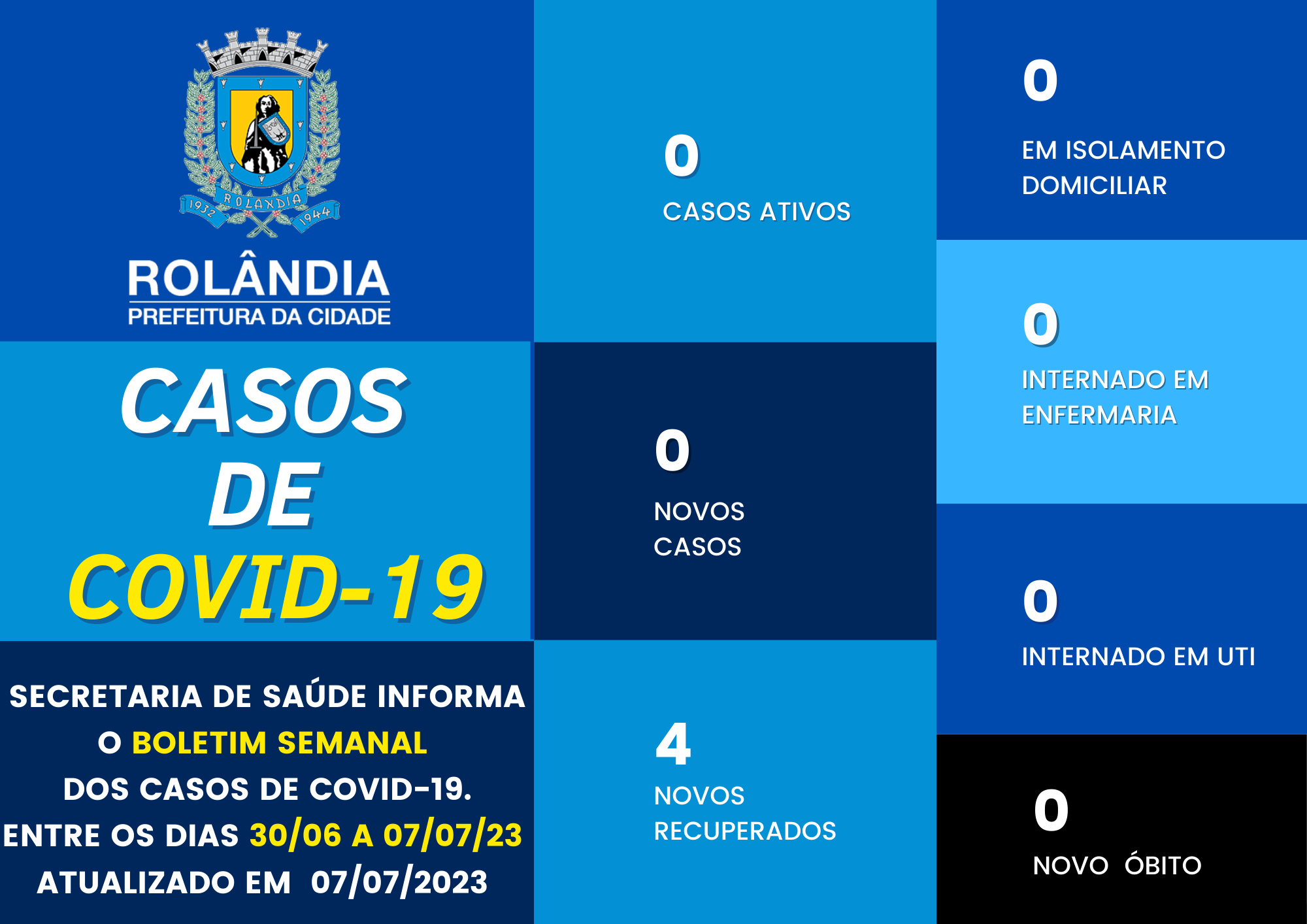 BOLETIM COVID-19A secretaria de Saúde informa que quatro pacientes se curaram de covid-19 nesta semana e que hoje, sexta-feira, 07/07/23, ROLÂNDIA NÃO TEM NENHUM CASO ATIVO DE COVID-19.Que siga assim!#rolandialivredacovid...