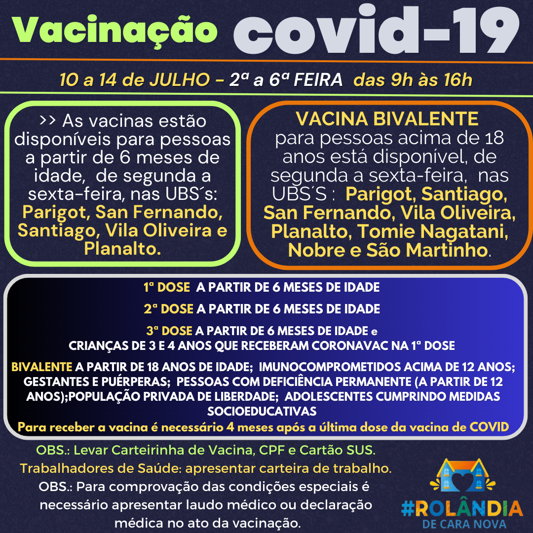 VACINAÇÃO COVID-19A secretaria de Saúde informa a programação de vacinação contra a covid-19.Não precisa agendar!Vem vacinar! PROGRAMAÇÃO VACINAS10 a 14 DE JULHO DE 2023 - das 9h às 16h. >>As vacinas contra COVID-19 estão disponíve...