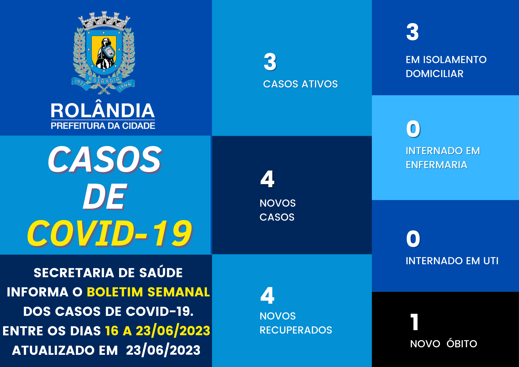 BOLETIM COVID-19 - 23.06.2023 - 13h40A secretaria municipal de Saúde informa sobre os casos de covid-19. Na atualização do boletim, quatro contaminações e quatro pacientes curados. Rolândia tem atualmente 3 pacientes com covid-19, todos em is...