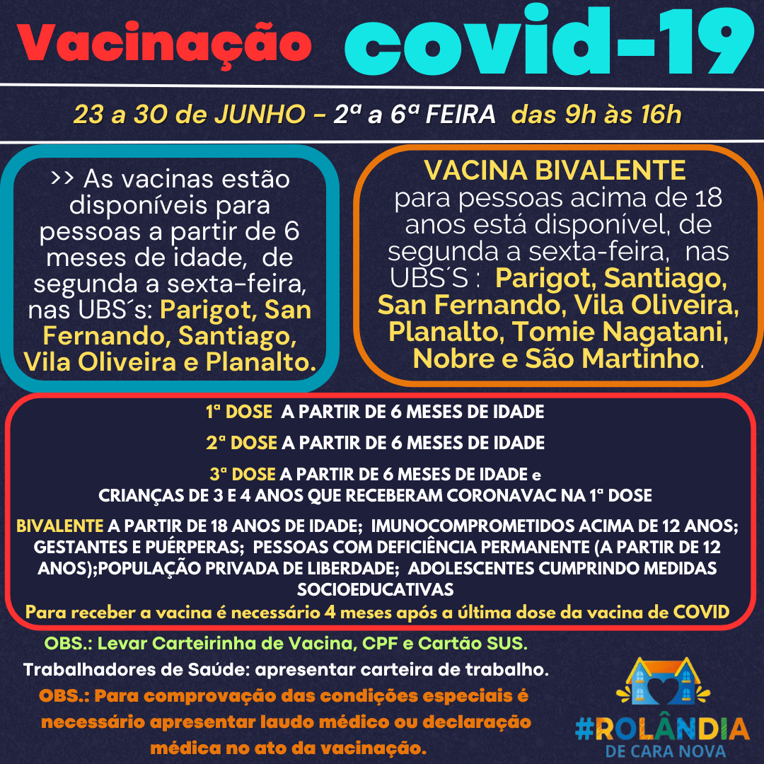 VACINAÇÃO COVID-19A secretaria de Saúde informa a programação de vacinação contra a covid-19.Não precisa agendar!Vem vacinar!PROGRAMAÇÃO VACINAS23 A 30 DE JUNHO DE 2023 - das 9h às 16h.>>As vacinas contra COVID-19 estão disponíveis, para...
