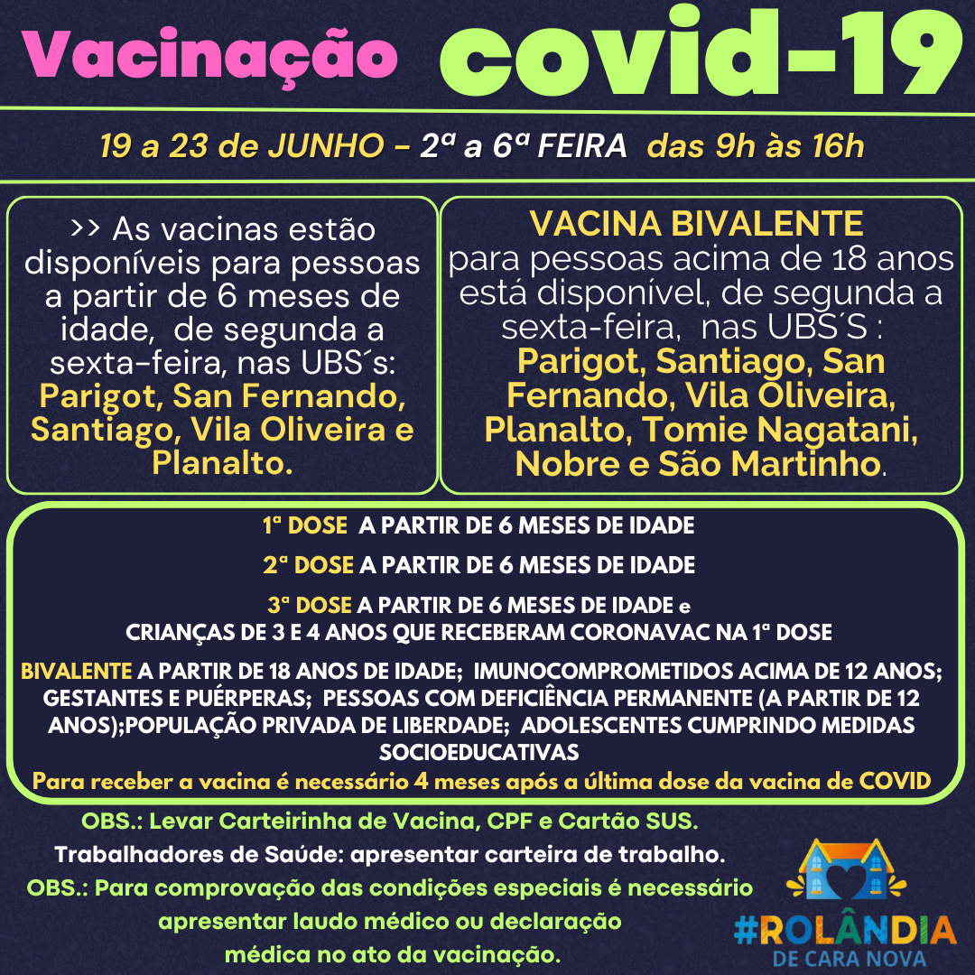 VACINAÇÃO COVID-19A secretaria de Saúde informa a programação de vacinação contra a covid-19.Não precisa agendar!Vem vacinar! PROGRAMAÇÃO VACINAS19 A 23 DE JUNHO DE 2023 - das 9h às 16h.>>As vacinas contra COVID-19 estão disponíveis, pa...