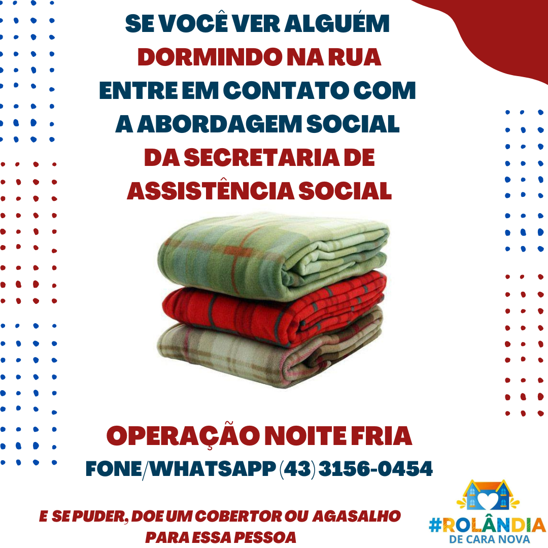 OPERAÇÃO "NOITE FRIA" NESTA QUINTA-FEIRAA secretaria de Assistência Social realiza, nesta quinta-feira, a "Operação Noite Fria". A ação oferece abrigo, agasalho e amparo às pessoas em situação de rua. Fone/WhatsApp (43) 3156-0454. #rola...