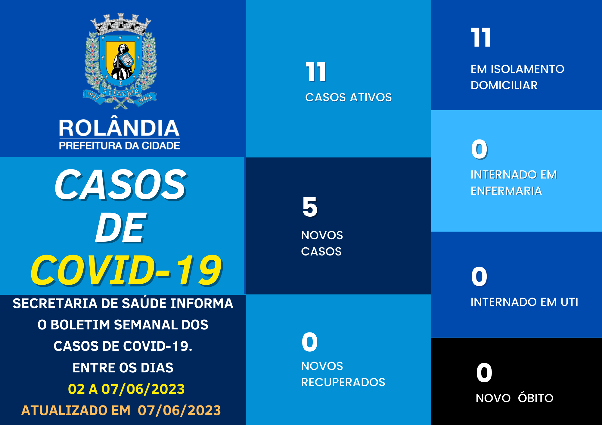 BOLETIM COVID-19 - 07.06.2023A secretaria municipal de Saúde informa sobre os casos de covid-19, entre os dias 02 a 07/06 de 2023. Na atualização do boletim, 5 contaminações e nenhum paciente curado. Rolândia tem 11 pacientes com covid-19, t...