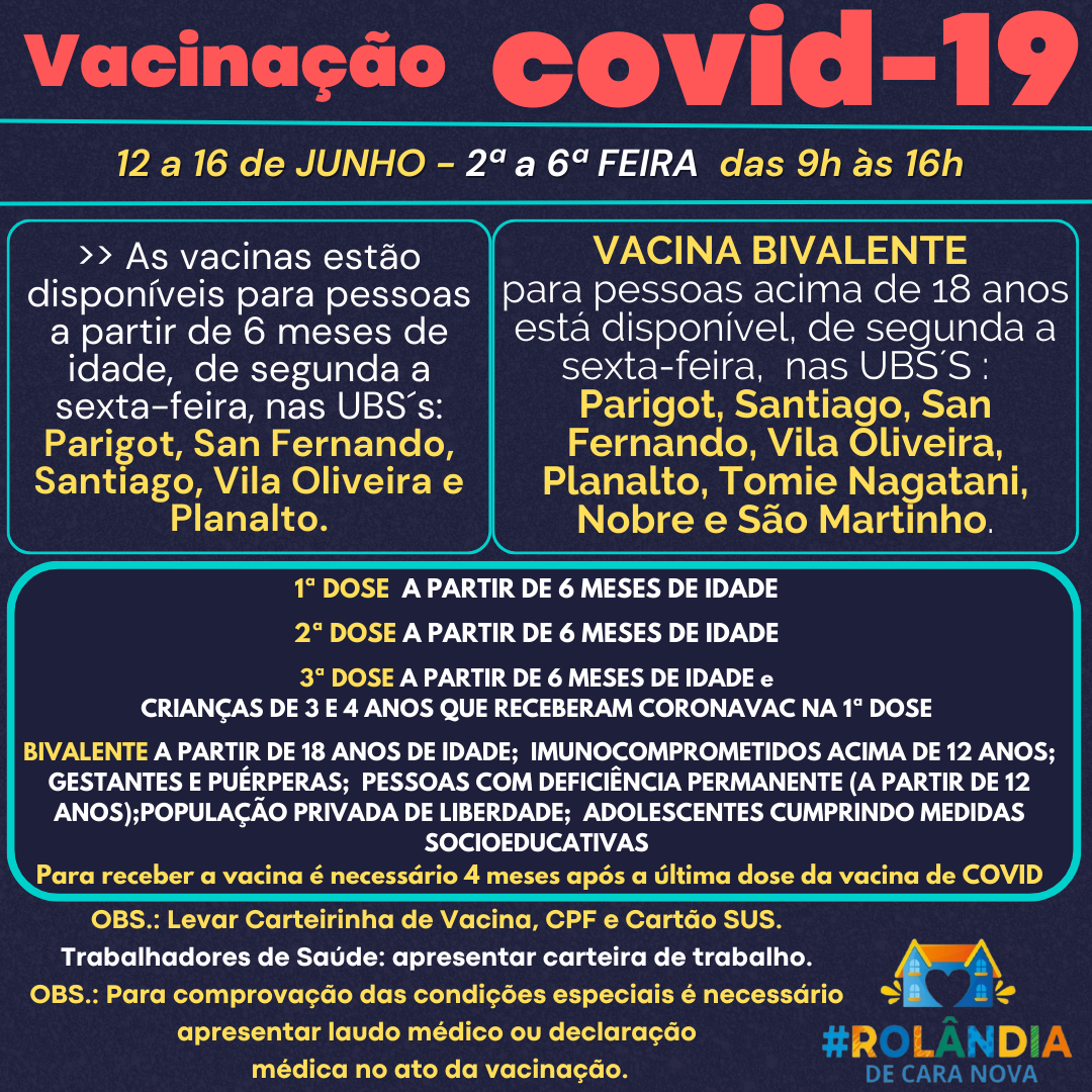 VACINAÇÃO COVID-19A secretaria de Saúde informa a programação de vacinação contra a covid-19.Não precisa agendar!Vem vacinar!PROGRAMAÇÃO VACINAS12 A 16 DE JUNHO DE 2023 - das 9h às 16h.>>As vacinas contra COVID-19 estão disponíveis, para...