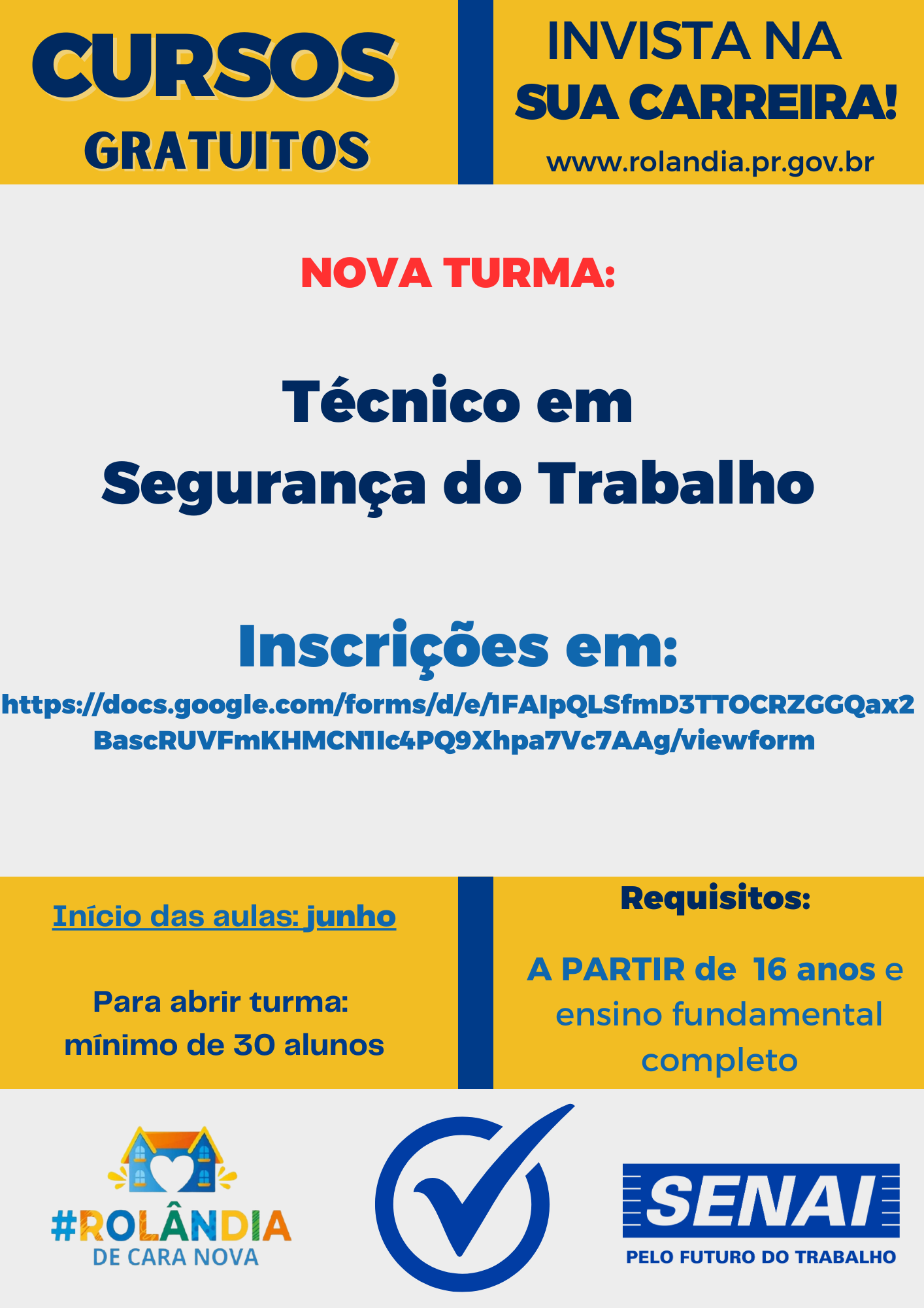 INSCRIÇÕES ABERTAS PARA CURSO GRATUITO EM "TÉCNICO DE SEGURANÇA NO TRABALHO"Devido ao sucesso e ao pedido por mais uma turma, a Prefeitura de Rolândia, por meio da secretaria de Desenvolvimento Econômico, e o Senai oferecem o curso gratuito em ...