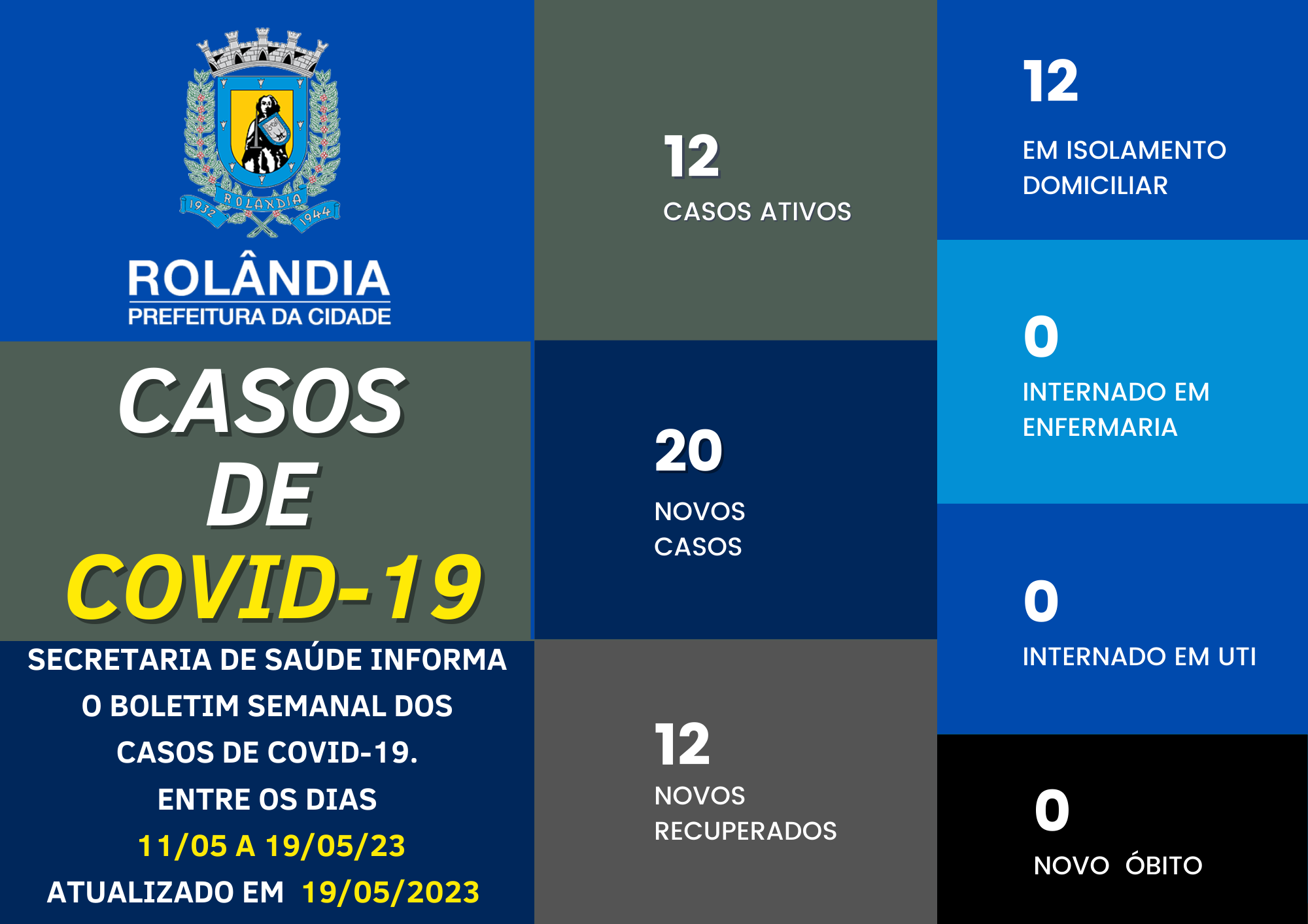 BOLETIM COVID-19A secretaria municipal de Saúde informa sobre os casos de covid-19, entre os dias 11/05 a 19/05 de 2023. Na atualização do boletim, 20 contaminações e 12 pacientes curados. Rolândia tem 12 pacientes com covid-19, todos em i...