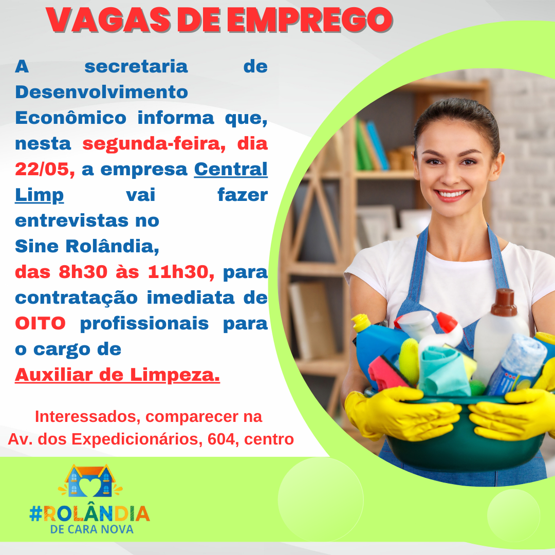 VAGAS DE EMPREGOA secretaria de Desenvolvimento Econômico informa que a Agência do Trabalhador/Sine Rolândia atende das 8h às 14h, de segunda a sexta, na Avenida dos Expedicionários, 604, centro.Para informações, 3255-1118.Atendimento por orde...