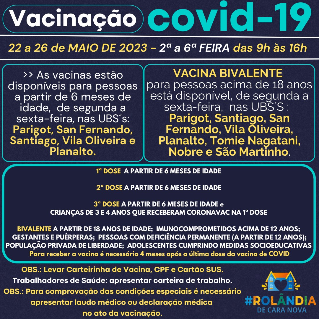 VACINAÇÃO COVID-19A secretaria de Saúde informa a programação de vacinação contra a covid-19.Não precisa agendar! Vem vacinar!PROGRAMAÇÃO VACINAS COVID-1922 a 26 de MAIO DE 2023 - das 9h às 16h.>>As vacinas contra COVID-19 estão disponív...