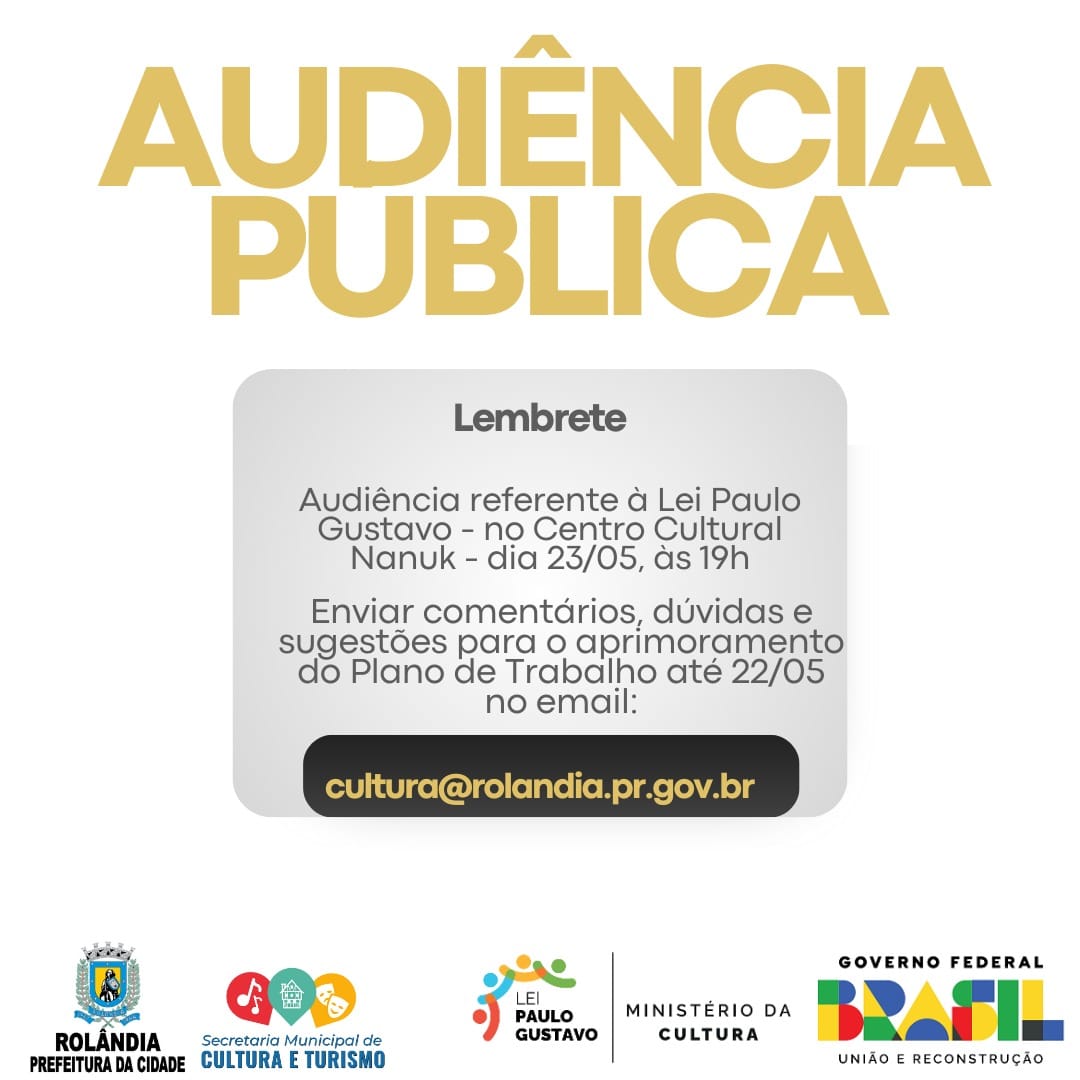 AVISO DE AUDIÊNCIA PÚBLICA - LEI PAULO GUSTAVOA Prefeitura Municipal de Rolândia, através da Secretaria de Cultura e Turismo, vem, por meio deste, convidar a todos os agentes culturais e interessados para participarem da AUDIÊNCIA PÚBLICA refer...