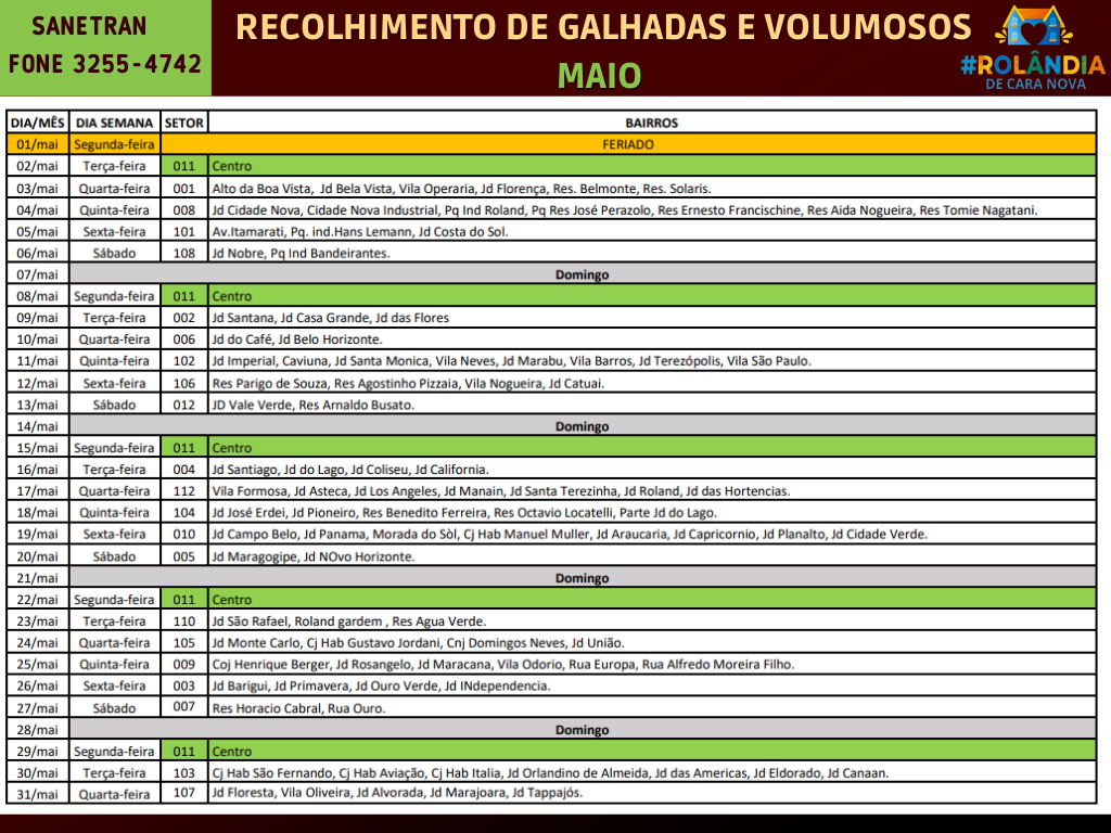 AGENDA DA SANETRAN PARA RECOLHER GALHADAS E VOLUMOSOS - MAIOA Secretaria de Agricultura e Meio Ambiente informa que a empresa terceirizada que presta serviço ao município, a SANETRAN, faz a divulgação das regiões em que vai passar recolhendo v...
