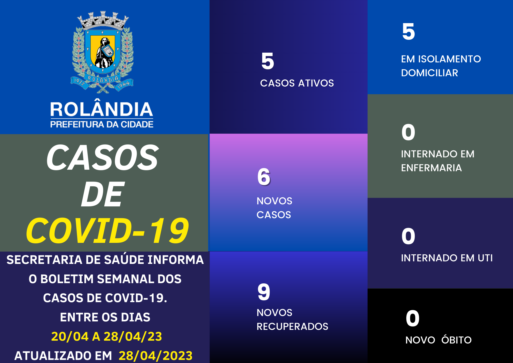 BOLETIM COVID-19 - 28.04.2023A secretaria municipal de Saúde informa sobre os casos de covid-19.Na atualização do boletim, seis contaminações e nove pacientes curados.Rolândia tem atualmente cinco pacientes com covid-19, todos em isolamento dom...