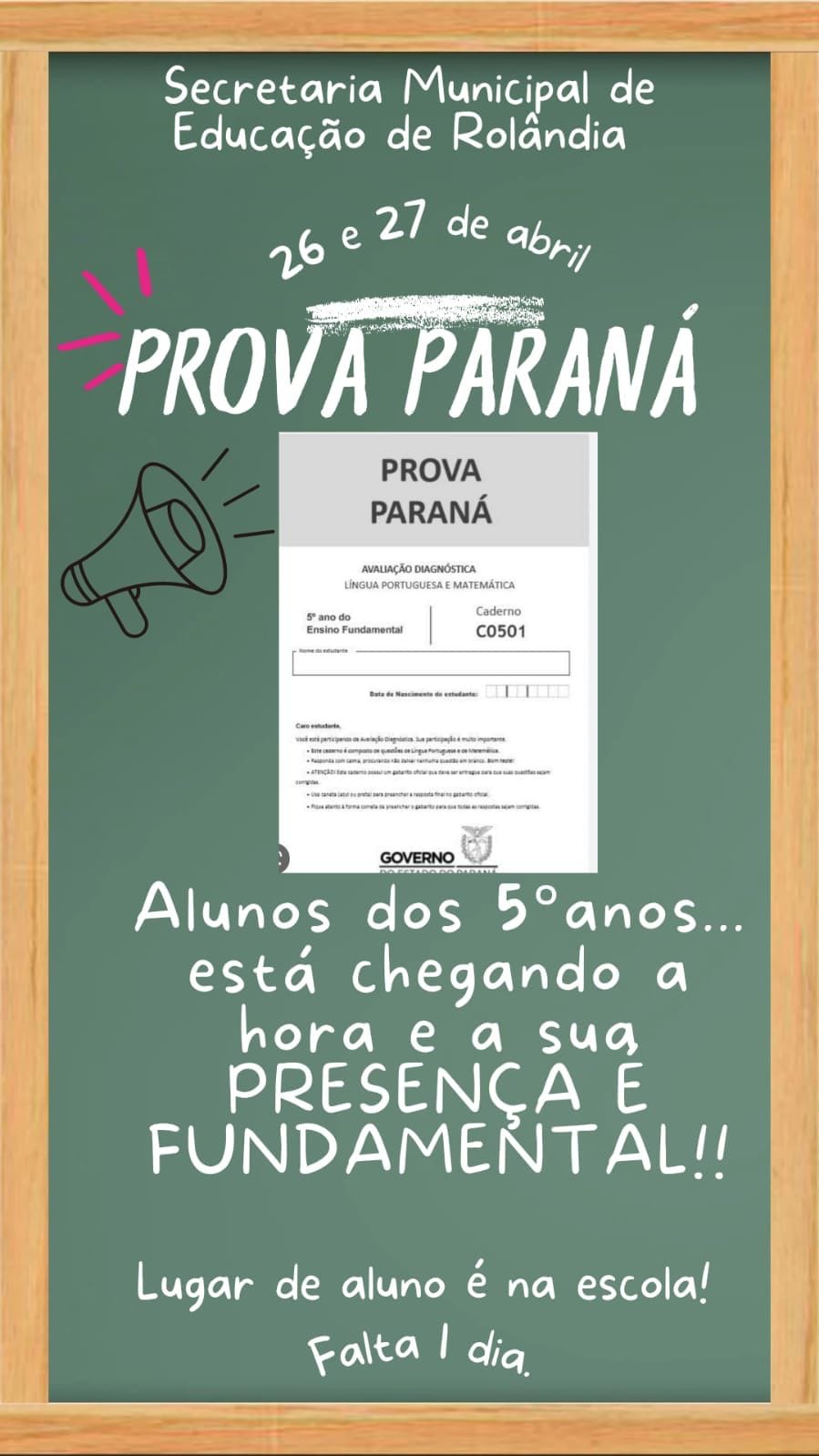 CERCA DE 880 ALUNOS DA REDE MUNICIPAL VÃO FAZER A "PROVA PARANÁ 2023"Nesta quarta e quinta, a secretaria municipal de Educação pede aos pais para que incentivem seus filhos e que eles venham participar da "Prova Paraná 2023".O exame será aplica...