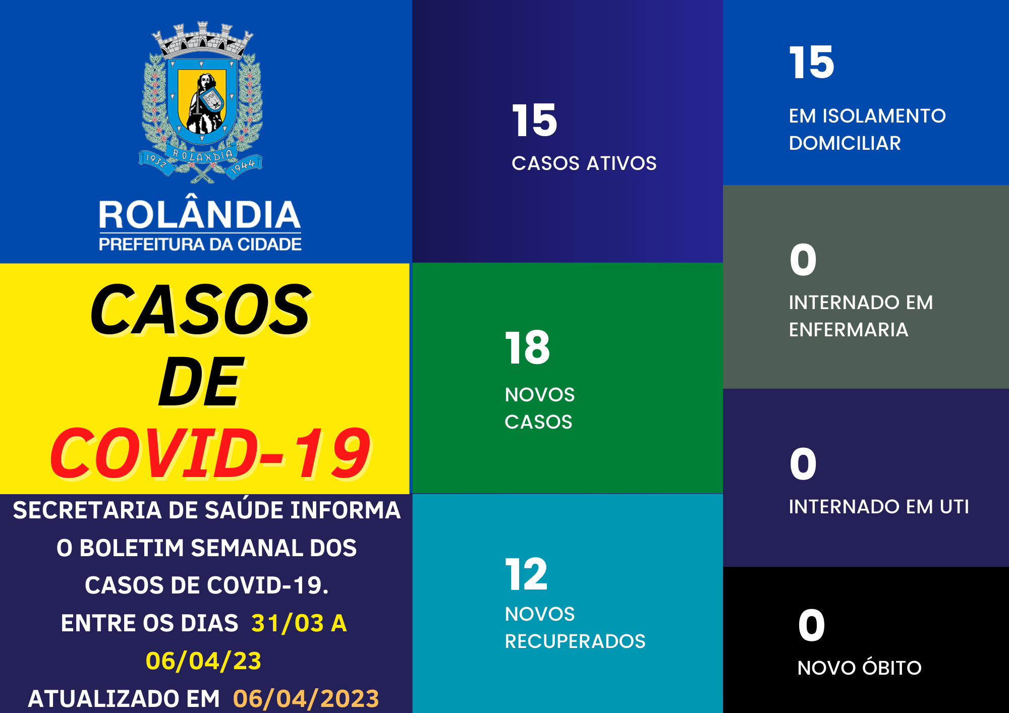 BOLETIM COVID-19 - 06.04.2023 A secretaria municipal de Saúde informa sobre os casos de covid-19. Na atualização do boletim, 18 contaminações e 12 pacientes curados. Rolândia tem atualmente 15 pacientes com covid-19, todos em isolamento domic...