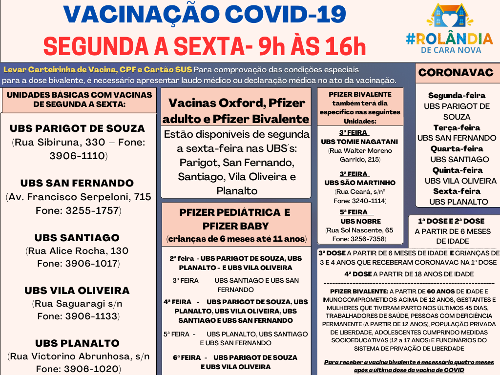 VACINAÇÃO COVID-19A secretaria de Saúde informa sobre a campanha de vacinação contra a covid-19.Confira o informe para os dias 10 a 14 de abril, das 9h às 16h: As vacinas Oxford, Pfizer adulto e Pfizer Bivalente estarão disponíveis todos o...