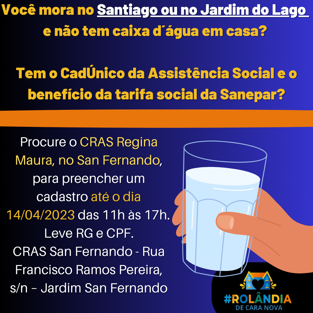 Você mora no Santiago ou no Jardim do Lago e não tem caixad´água em casa?Tem o CadÚnico da Assistência Social e o benefício da tarifa social da Sanepar?Procure o CRAS Regina Maura, no San Fernando, para preencher um cadastro até o dia 14/04/2...