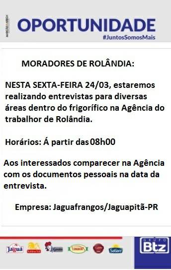 Mutirão do emprego: JaguafrangosA secretaria de Desenvolvimento Econômico informa sobre o mutirão do emprego, nesta sexta-feira! Participe!>> Agência do Trabalhador/Sine Rolândia atende na Avenida dos Expedicionários, 604, centro. ...