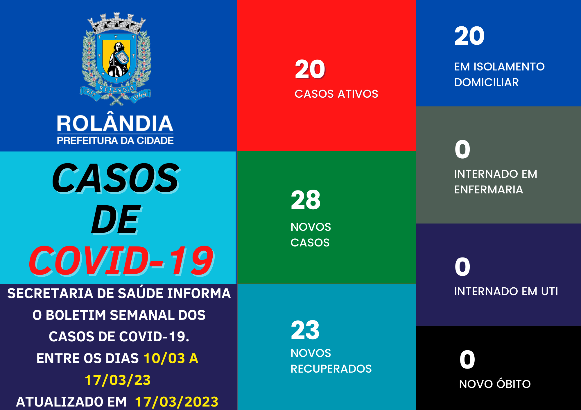 BOLETIM COVID-19A secretaria municipal de Saúde informa sobre os casos de covid-19, entre os dias 10 a 17/03 de 2023.Na atualização do boletim, 28 contaminações e 23 pacientes curados. Rolândia tem 20 pacientes com covid-19, todos em isolamento...