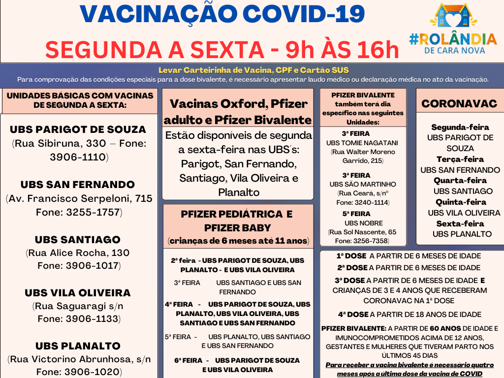 PROGRAMAÇÃO VACINAS COVID-19 27 a 31 de MARÇO DE 2023Vacinação das 9h às 16hA secretaria informa sobre a oferta de vacinas contra a covid-19. Leve a Carteirinha de Vacinação, CPF e Cartão SUS. Para comprovação das condições especia...