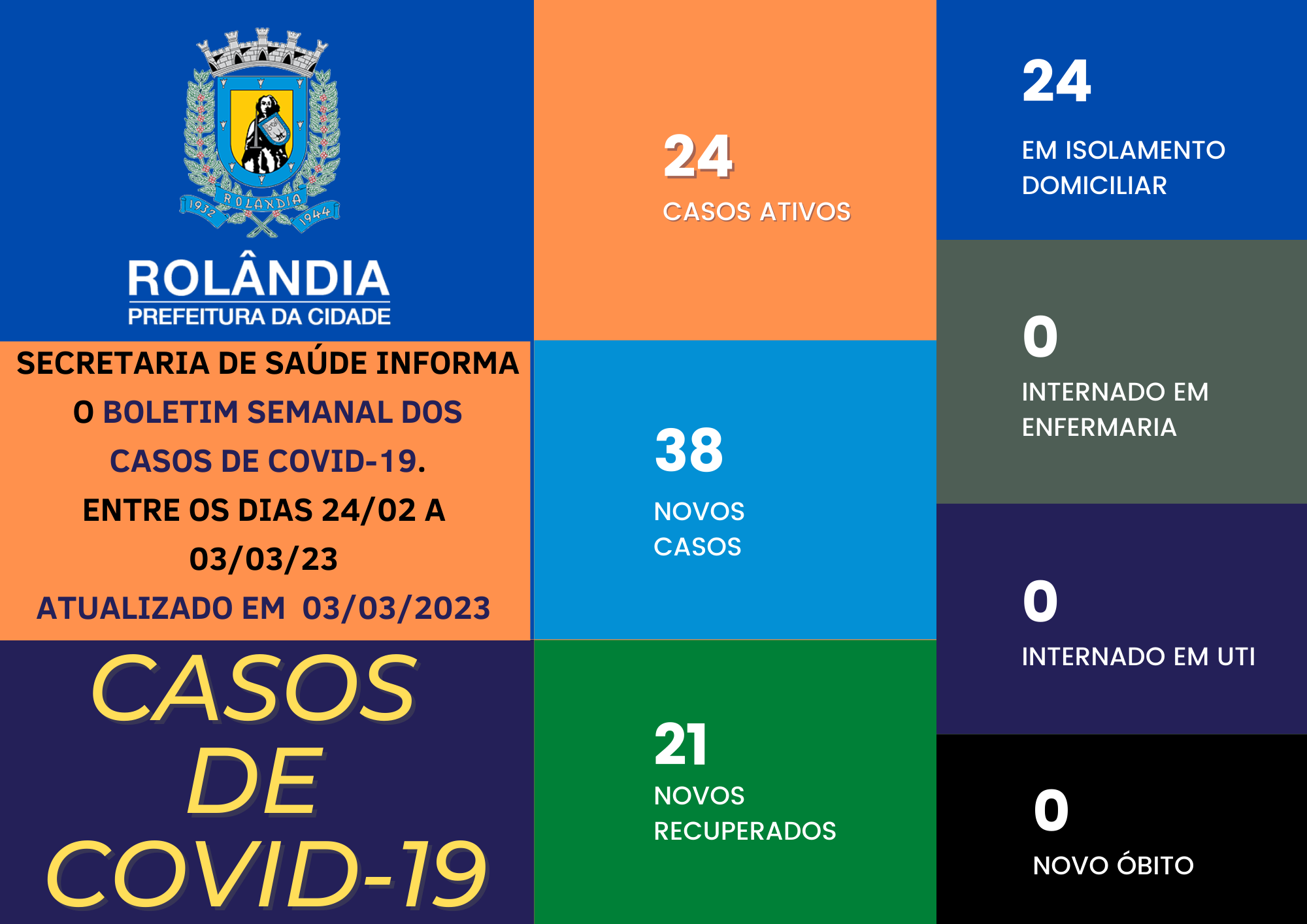 BOLETIM COVID-19 - 03.03.2022 - 14h A secretaria municipal de Saúde informa sobre os casos de covid-19. Na atualização do boletim, 38 contaminações e 21 pacientes curados. Rolândia tem atualmente 24 pacientes com covid-19, todos em isolament...