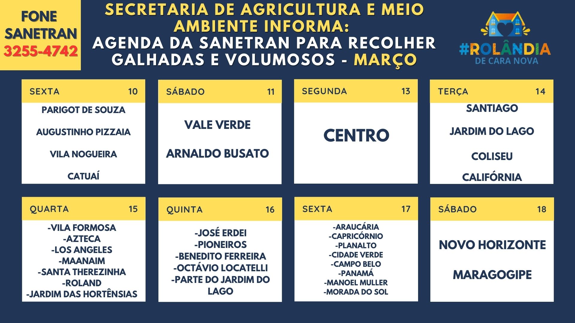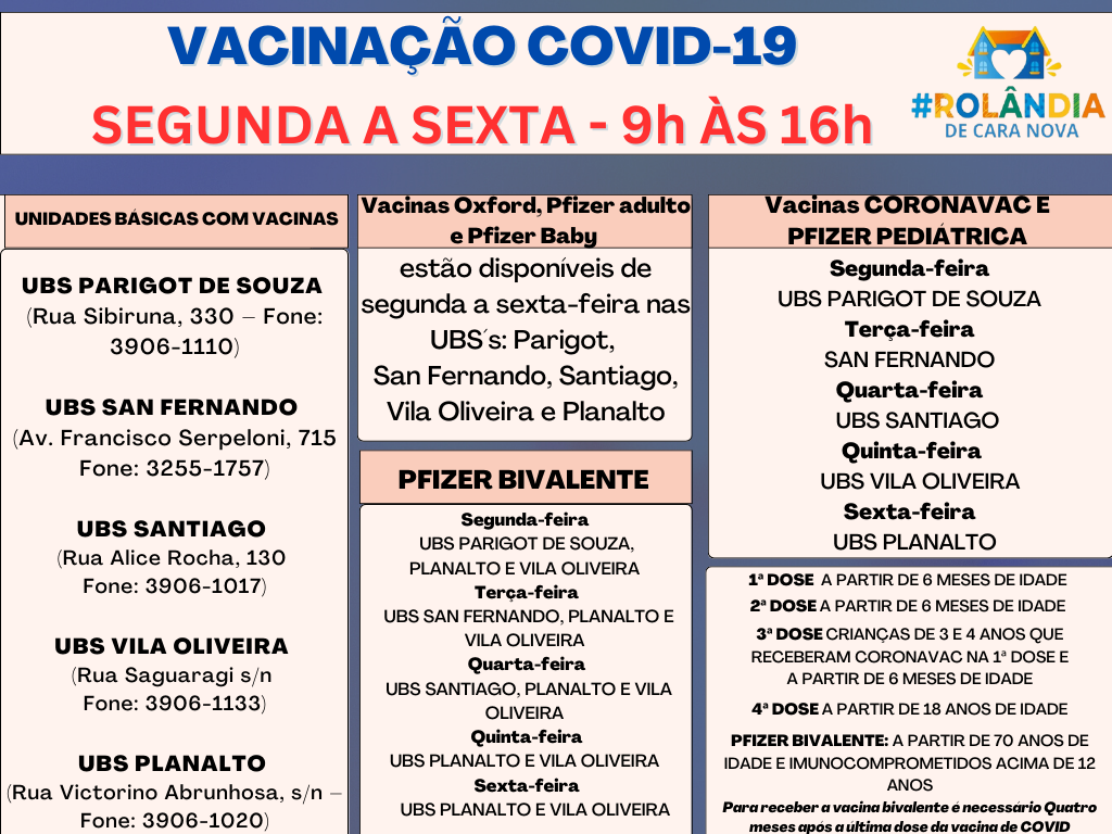 PROGRAMAÇÃO VACINAS COVID-19: 06 a 10 de MARÇO DE 2023Das 9h às 16hA secretaria de Saúde informa a vacinação em Rolândia: As vacinas Oxford, Pfizer adulto e Pfizer Baby estão disponíveis de segunda a sexta-feira nas UBS´s: Parigot, Sa...