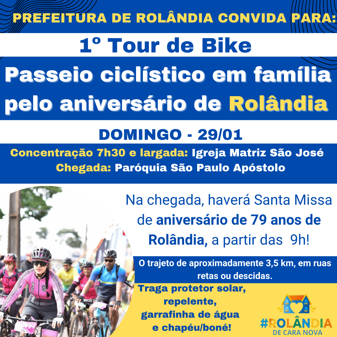 Tour de bike do aniversário de RolândiaA secretaria de Cultura e Turismo convida para o 1º passeio de bicicleta em família! Vamos passar momentos agradáveis em família e ainda fazer um tour pela cidade, de bicicleta. Passaremos pelos pri...