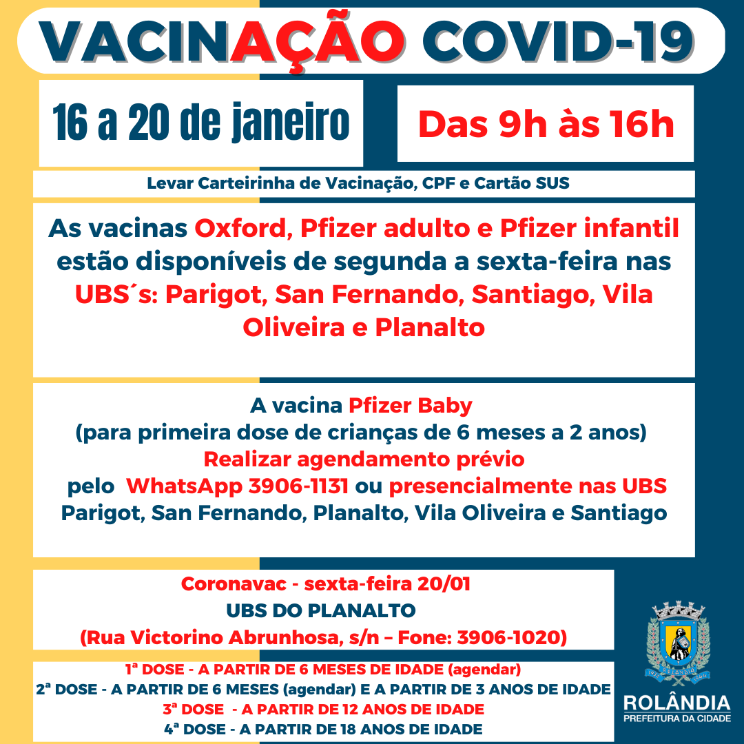 PROGRAMAÇÃO VACINAS16 a 20 de janeiro de 2023A secretaria de Saúde informa sobre a programação semanal de vacinação contra a covid-19:1ª DOSE - A PARTIR DE 6 MESES DE IDADE (agendar)2ª DOSE - A PARTIR DE 6 MESES (agendar) E A PARTIR DE 3 ANO...