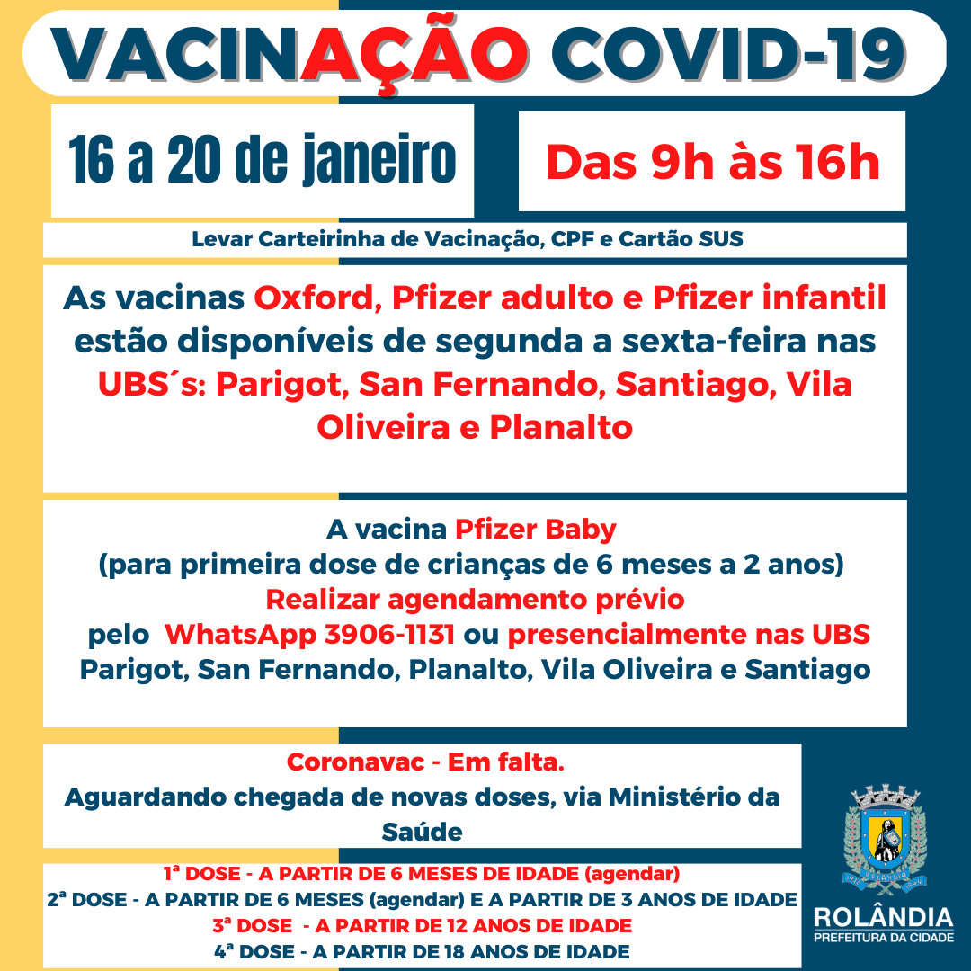 PROGRAMAÇÃO VACINAS CONTRA A COVID-19A secretaria de Saúde informa sobre a programação semanal de vacinação contra a covid-19, entre os dias 16 a 20 de janeirode 2023:1ª DOSE - A PARTIR DE 6 MESES DE IDADE (agendar)2ª DOSE - A PARTIR DE 6 ME...