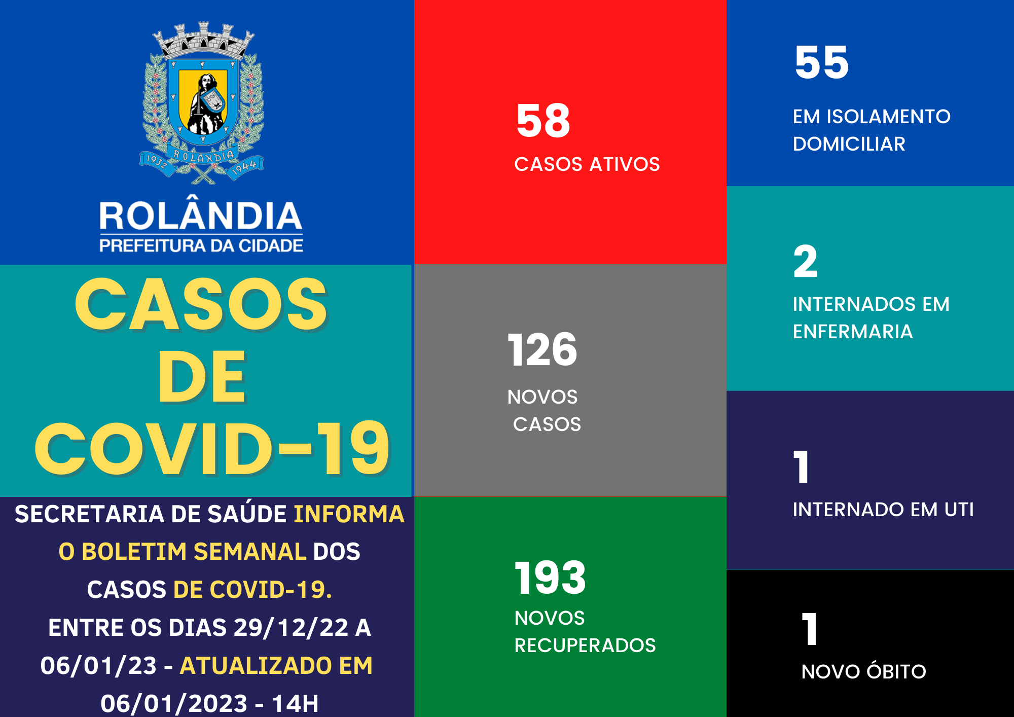 BOLETIM COVID-19 - 29/12/22 a 06/01/23 - 14hA secretaria municipal de Saúde informa sobre os casos de covid-19. Na atualização do boletim semanal, 126 contaminações e 193 pacientes curados. Rolândia tem atualmente 55 pacientes com covid-19, ...