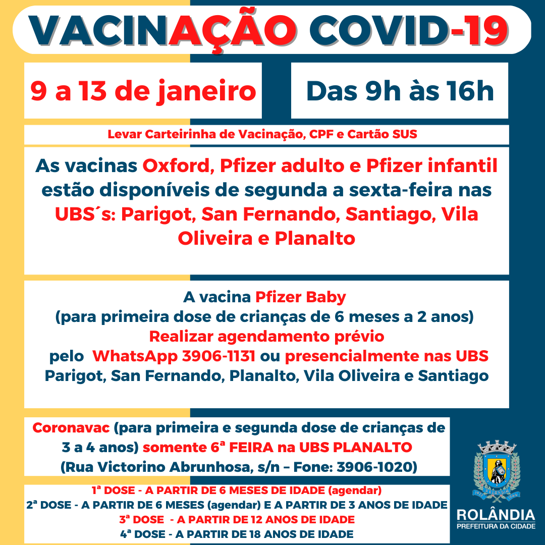 PROGRAMAÇÃO VACINAS09 a 13 de janeiro de 2023 A secretaria de Saúde informa sobre a programação semanal de vacinação contra a covid-19:1ª DOSE - A PARTIR DE 6 MESES DE IDADE (agendar)2ª DOSE - A PARTIR DE 6 MESES (agendar) E A PARTIR DE 3 A...