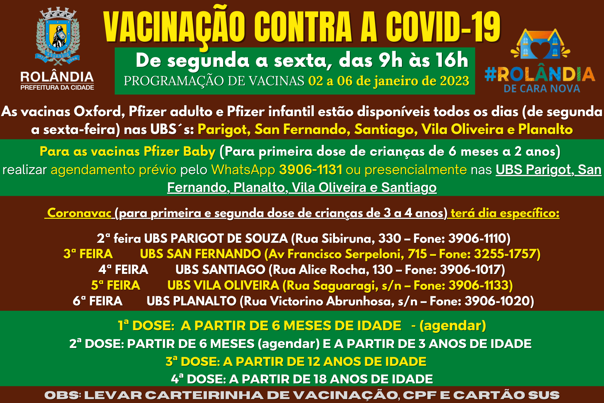 PROGRAMAÇÃO SEMANAL - VACINAS CONTRA A COVID-19 Entre os dias 2 a 6 de janeiro de 2023. Vacinação de 2ª a 6ª FEIRA das 9h às 16h. A secretaria de Saúde informa: As vacinas Oxford, Pfizer adulto e Pfizer infantil estarão disponíveis tod...