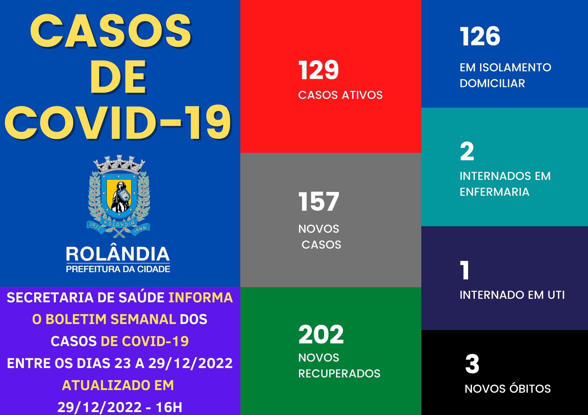BOLETIM COVID-19 - 29.12.2022 - 16HA secretaria municipal de Saúde informa sobre os casos de covid-19. Na atualização do boletim, do período entre 23 a 29 de dezembro, foram 157 contaminações e 202 pacientes curados. Rolândia...